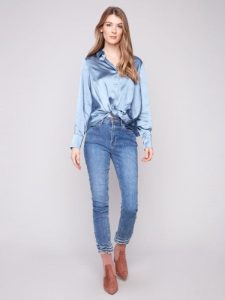 Elevate your wardrobe with the Charlie B Satin Button-Down Shirt featuring a stylish twisted front detail. Crafted from a soft blend of 97% polyester and 3% spandex, this 23-inch back-length shirt offers a comfortable fit with a touch of stretch. Perfect for both work and weekend, it combines elegance and ease. Easy care instructions ensure it stays looking freshāhand wash cold, hang to dry, and iron at a low setting. A versatile, flattering piece that enhances any outfit with effortless sophistication.